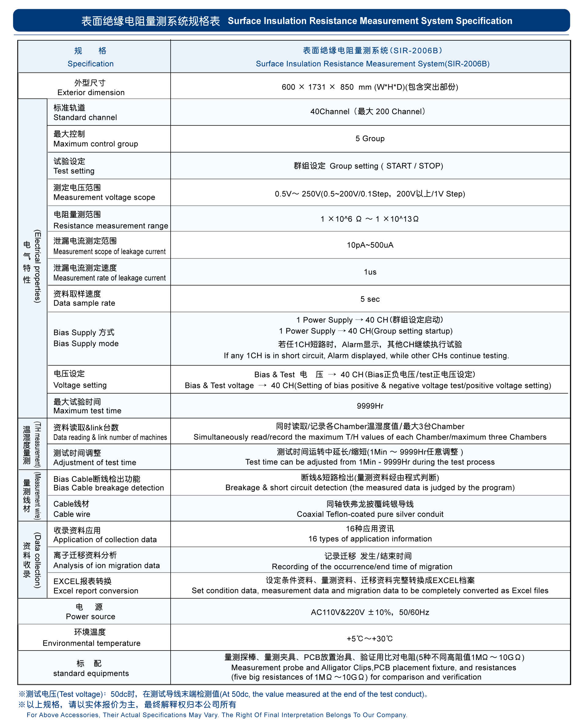 扫瞄式的表面绝缘电阻量测系统(SIR-2006B-250V),可扩充达200轨的迁移量测,而且突破传统扫瞄式表面绝缘电阻量测系统的极限,无法记录迁移结束时间还有纪录迁移发生时间,让客户以最少的设备成本,可以得到最大的生产效益。